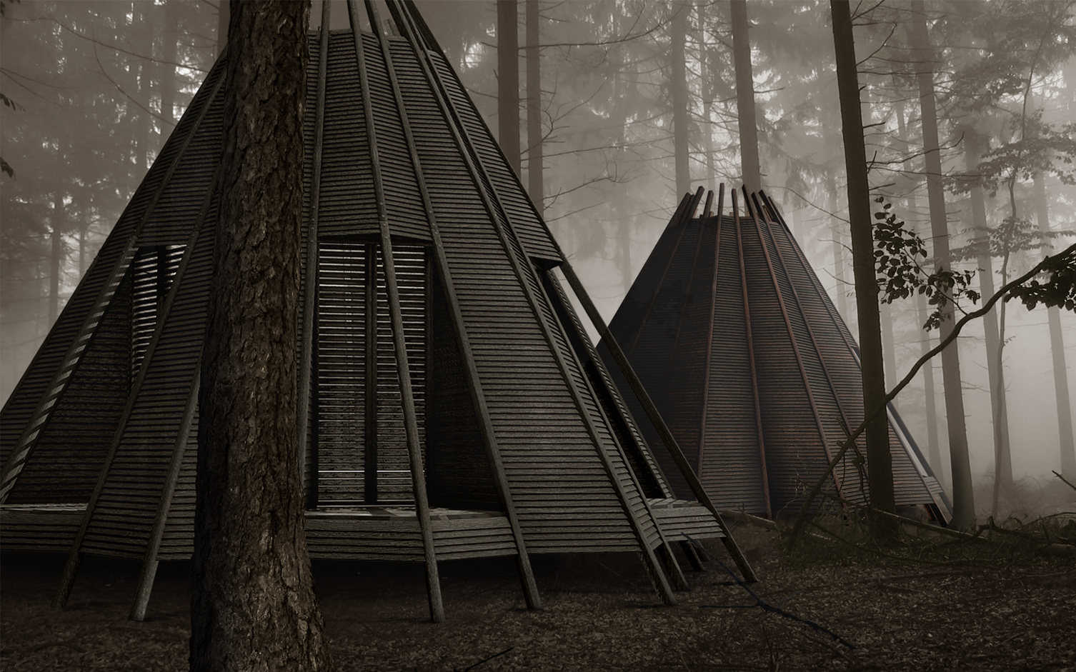 Slatted wooden clad panels are attached to the main frame using timber native to that particular area. As the structure ages, these wooden panels weather, blending more into the surroundings. The slats are angled and layered to keep out the elements creating a run off for the rain. The Roof of the structure holds a large skylight. A series of slatted Glass framed doors/Windows repeat the same slatted design as the outer structure apart from they can be Louvred from the inside to screen out the light. This appies to the Sky light as well. The Nooks can be placed in any environment from Sloped Hills, Forests, Coastal areas and can even be used as a Raft type structure on water.
